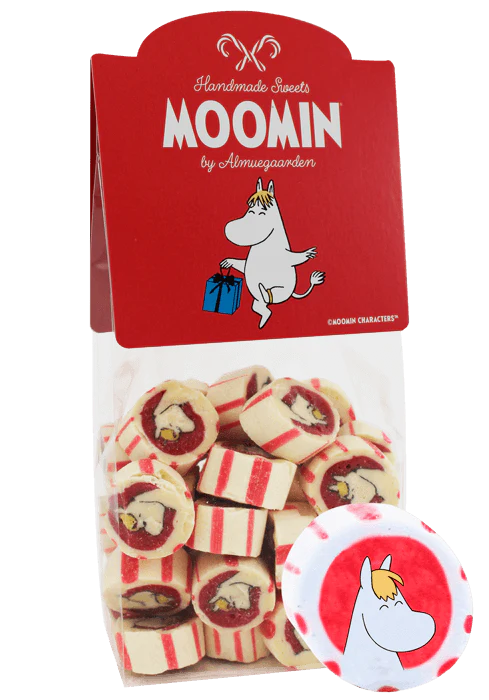 Disse Mumi bolcher er håndlavede i Danmark af det lille familiedrevne bolchekogeri Almuegaarden, ved brug af de bedste naturlige ingredienser, traditionelt dansk håndværk og med fuld respekt for Tove Jansonns originale Mumi illustrationer.