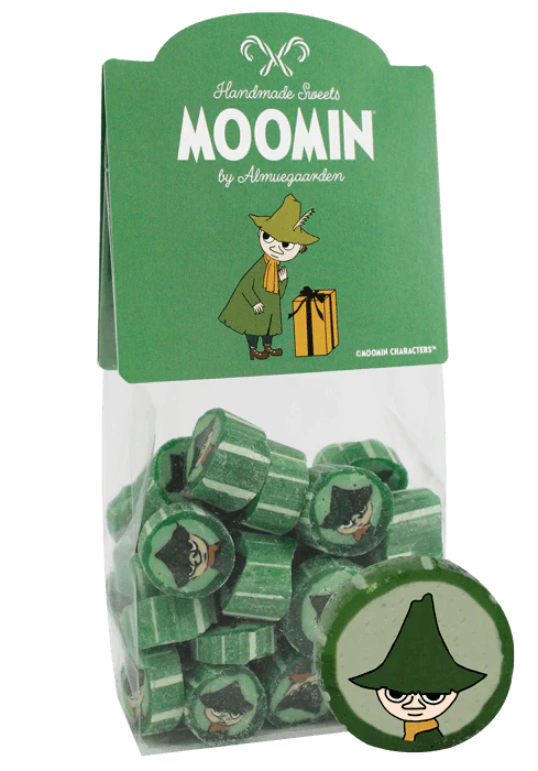 Disse Mumi bolcher er håndlavede i Danmark af det lille familiedrevne bolchekogeri Almuegaarden, ved brug af de bedste naturlige ingredienser, traditionelt dansk håndværk og med fuld respekt for Tove Jansonns originale Mumi illustrationer.