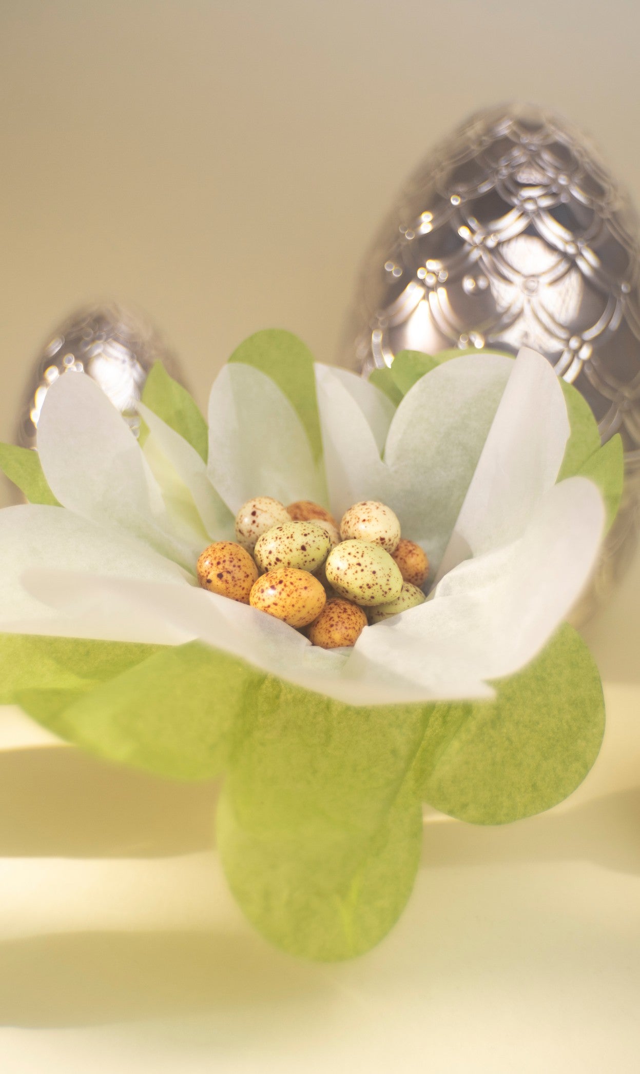 Det ikoniske sølvæg er både en påsketradition og kærlig forårsgave, fyldt med fine hånddekorerede, økologiske chokoladeæg i smukke farver og med skønne fyldninger. Juvelér Carl Fabergés kunstneriske og historiske påskeæg er inspirationen til de sirlige guirlander på årets sølvæg.